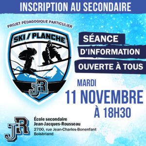 Une soirée d’information en vue de l’inscription au programme Ski/Planche 2026-2027 se tiendra le 11 novembre 2025 à 18h30, à la bibliothèque de l’école.